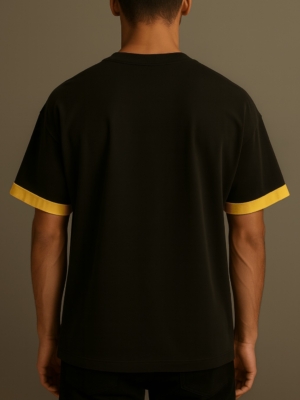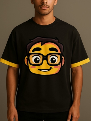 Trendy black oversized cotton t-shirt with a fun cartoon face print and contrast yellow sleeves. Made from 240 GSM heavyweight cotton for premium comfort &…