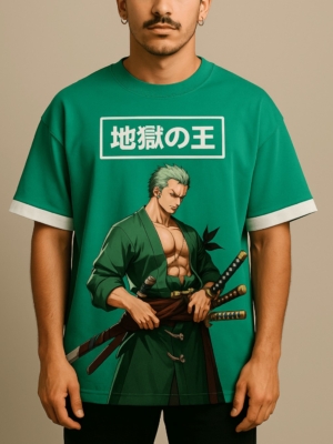 The Roronoa Zoro Oversized T-Shirt in Old Money Green with 240 GSM premium cotton. Perfect for anime fans & Gen Z streetwear lovers. Step into…