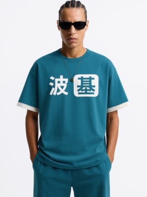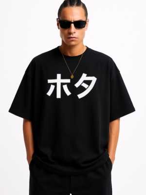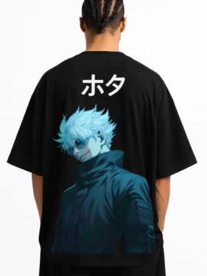 Oversized black anime t-shirt with Japanese text on the front and bold anime character graphic on the back. Crafted from 240 GSM heavyweight cotton for…