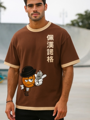 Men’s Brown Oversized Cotton T-Shirt | 240 GSM – Cartoon Print Streetwear