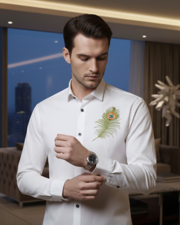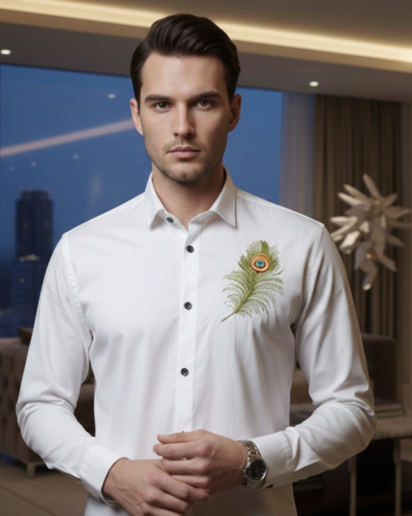 The hand-crafted peacock feather embroidery on the chest symbolizes pride and charm, adding a refined yet statement look without overpowering the classic white base.